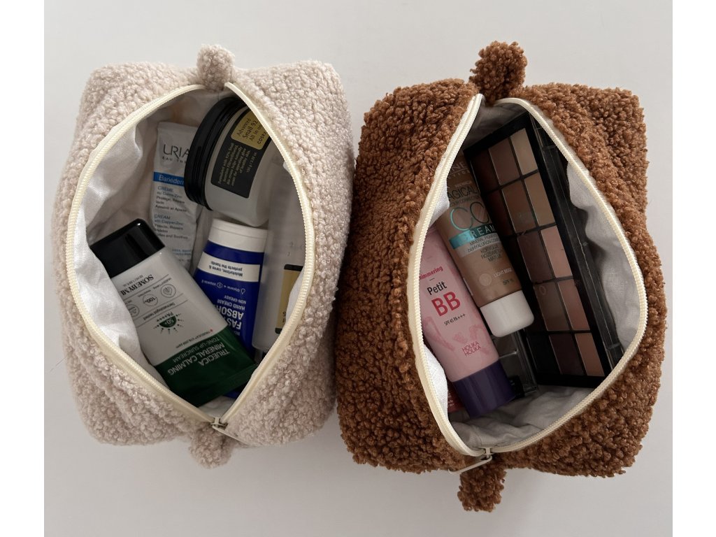 Kosmetická taška je vyrobena z měkké plyšové látky, která je příjemná na dotek. Uvnitř taštičky je výztuha, díky které taštička drží tvar, je příjemně nadýchaná a působí stabilně.