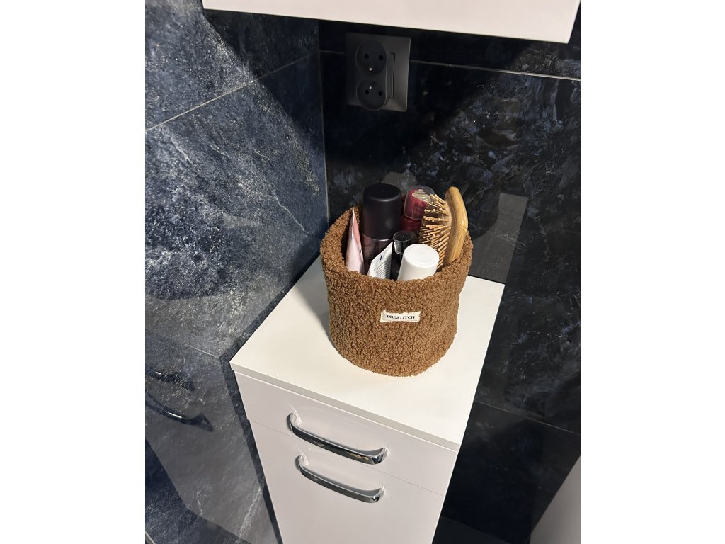 Je ušitý celý z měkké plyšové látky, včetně vnitřní části, díky čemuž působí čistě, jednotně a příjemně na dotek i uvnitř. Pro lepší stabilitu je košík vyztužený pevnějším materiálem, který pomáhá udržet tvar a zabraňuje převracení i při běžném používání.