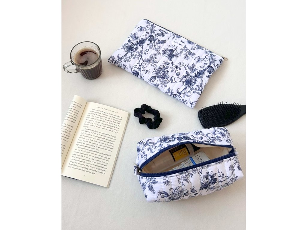 1x Plochá kosmetická taška Prestitch | Floral (temně modrá)